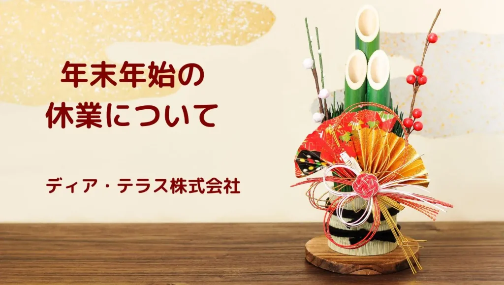 日頃よりディア・テラス株式会社をご愛顧いただき、誠にありがとうございます。誠に勝手ながら、年末年始は下記の期間を休業とさせていただきます。 休業期間:2025年12月27日(土)〜2026年1月4日(日) 御用始め:2026年1月5日(月) 休業期間中にいただ... -