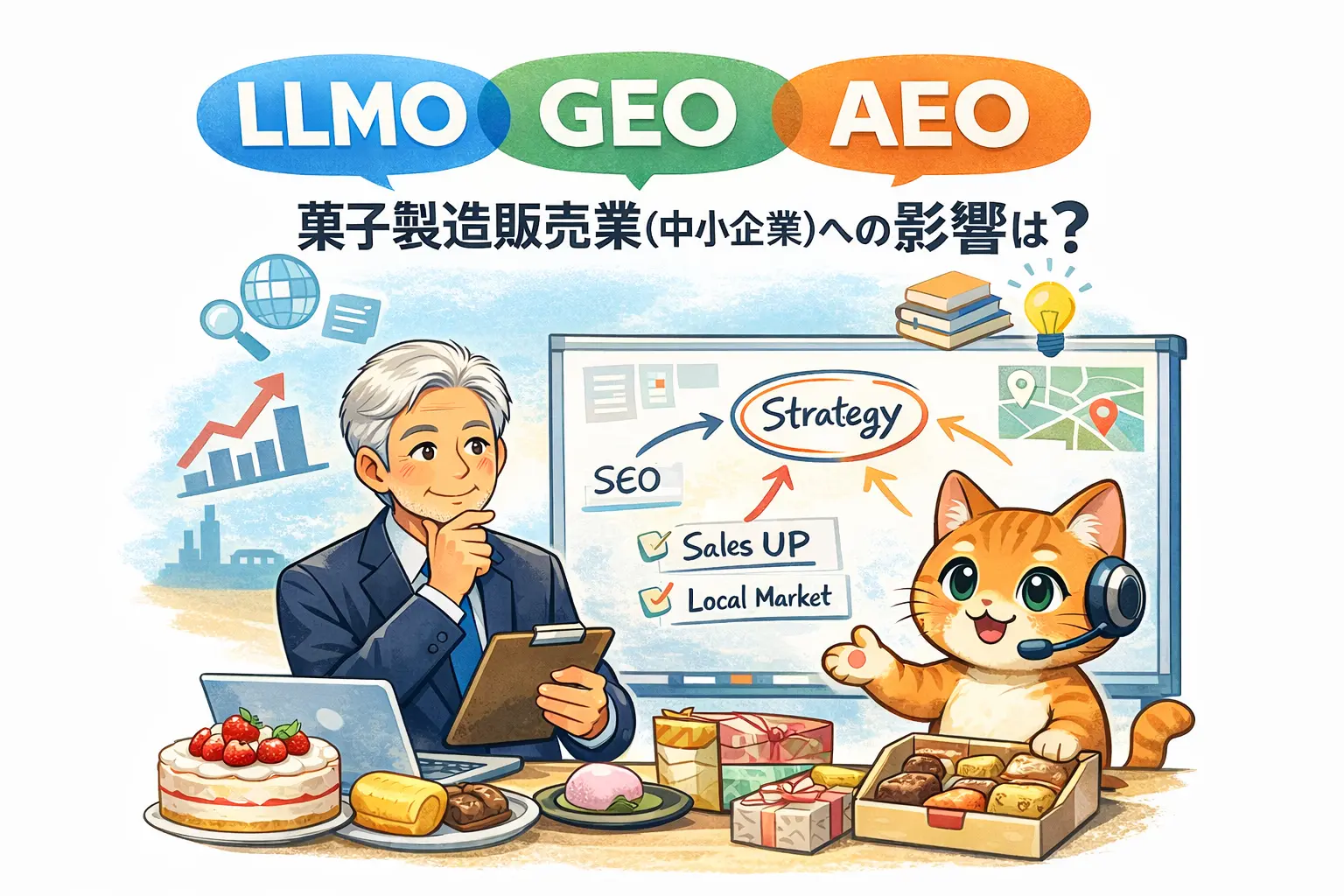 そこで今回は、みっ太(ChatGPT)とお父さん(社長)の対話形式で、LLMO(エルモ)/GEO/AEOという“似た言葉”をすっきり整理しつつ、中小企業、とくに「菓子製造販売業(つくって売る)」の現場で何が起きるのか、そして明日から何をするのが最短かを、流れでお話しします。